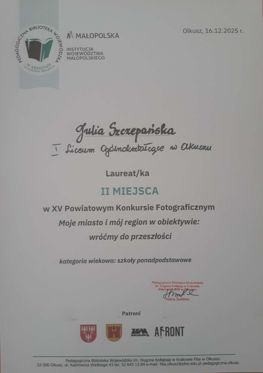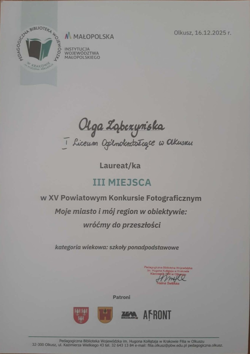 We wtorek 16.12.2025 roku w BWA w Olkuszu miał miejsce Finał XV Powiatowego Konkursu Fotograficznego: „Moje miasto i mój region w obiektywie”. Tegoroczna edycja zatytułowana była: „Wróćmy do przeszłości”. Niezwykle miło nam poinformować o sukcesach naszych uczennic.