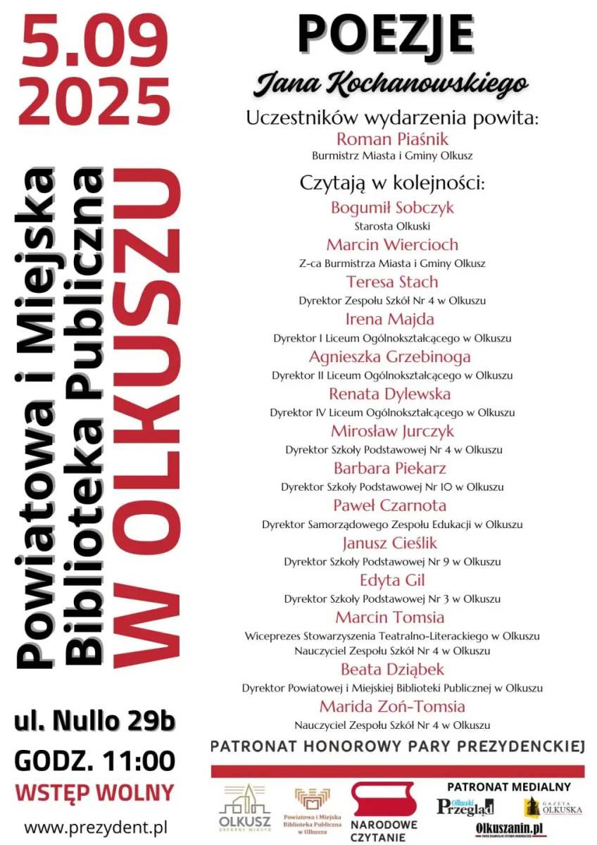 „Narodowe Czytanie” pod honorowym patronatem Pary Prezydenckiej odbywa się w tysiącach miejsc w Polce i zawsze przypada na pierwszą sobotę września.