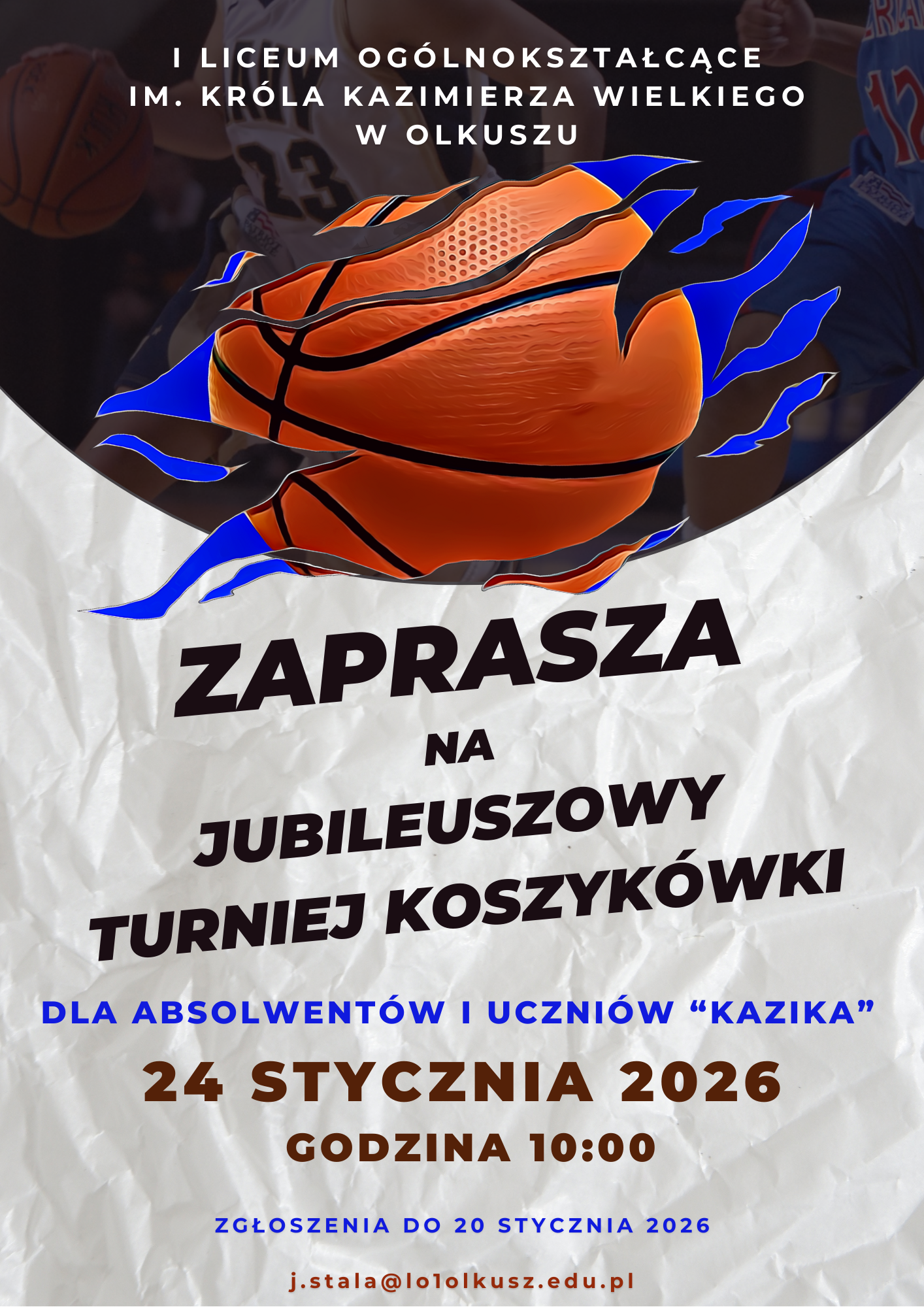 I Liceum Ogólnokształcące im. Króla Kazimierza Wielkiego w Olkusz serdecznie zaprasza Absolwentów i Uczniów na Jubileuszowy Turniej Koszykówki, który odbędzie się 24 stycznia 2026 roku na sali gimnastycznej w I Liceum w Olkuszu, ulica Polna 8.